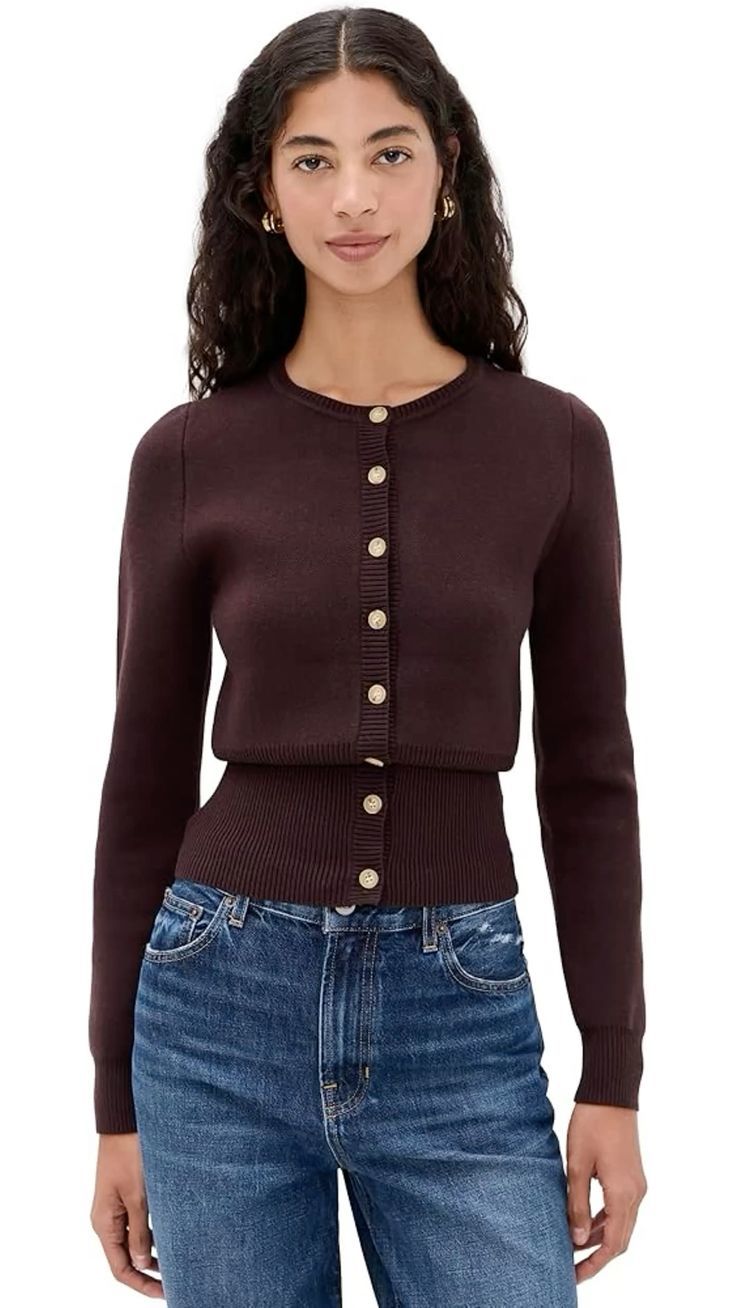 Отдельного внимания заслуживает короткий приталенный кардиган на пуговицах. Застегнутый полностью, он становится почти топом. Расстегнутый наполовину — приглашением к лёгкой асимметрии. Почему он снова на вершине