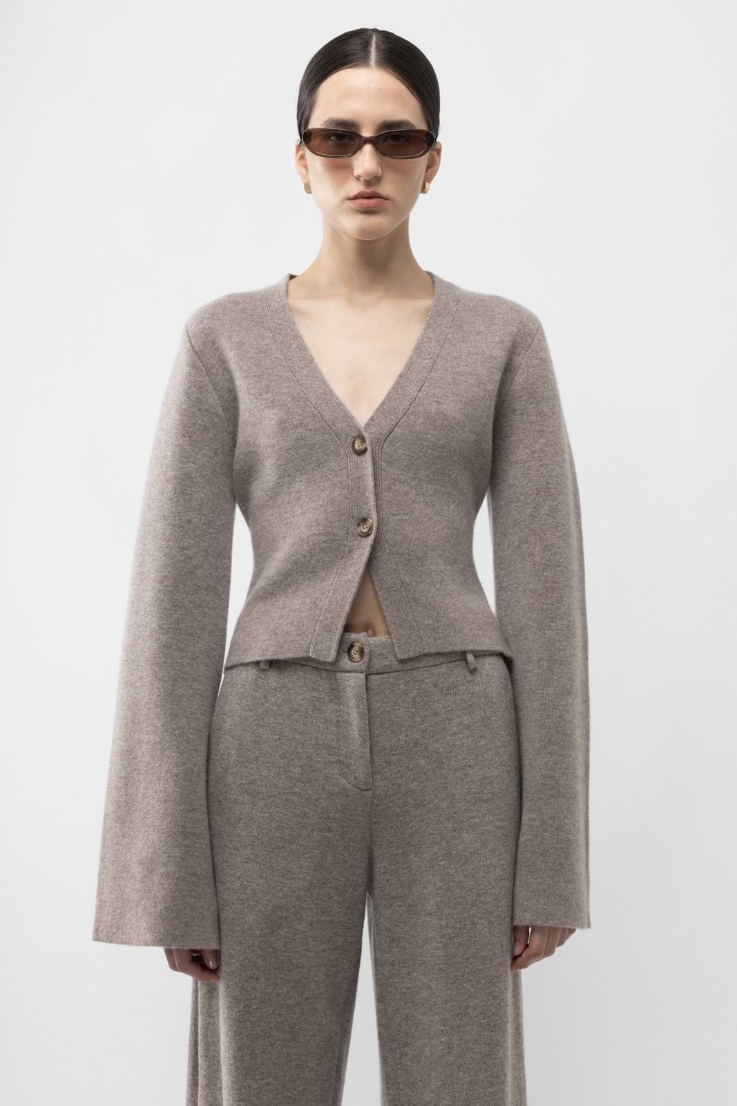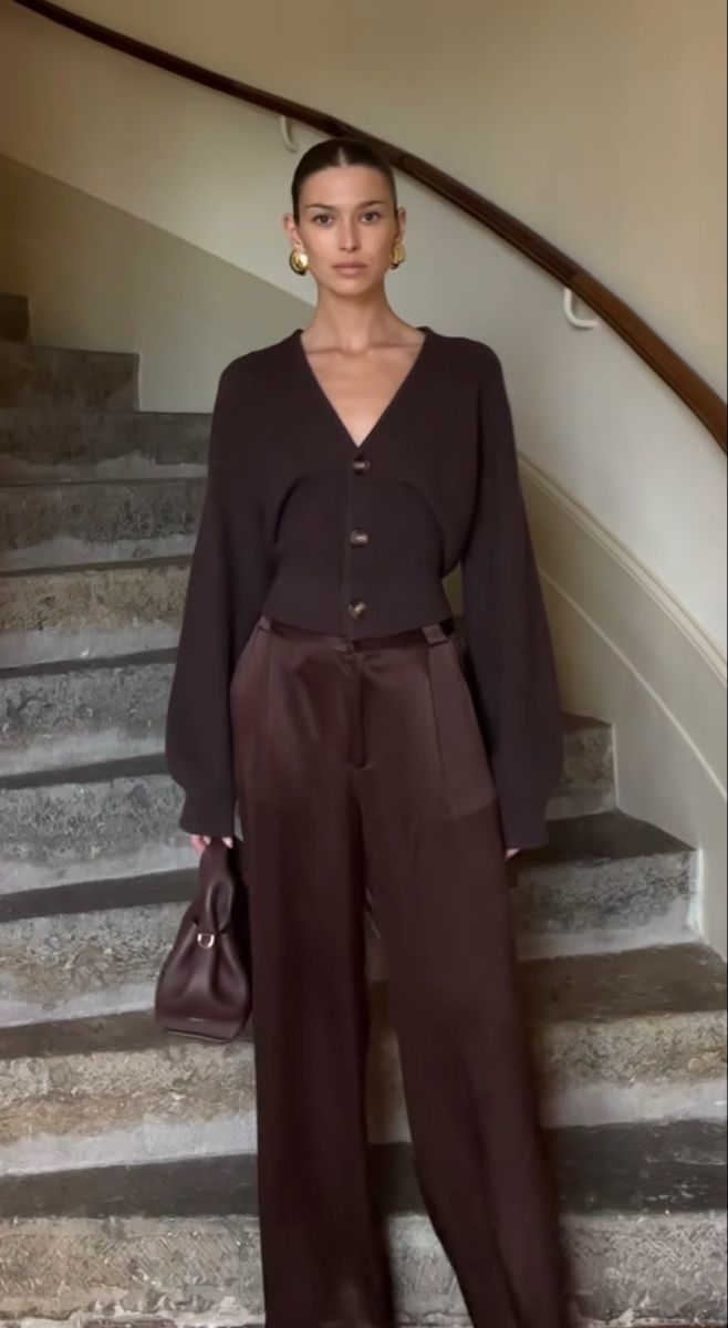 Отдельного внимания заслуживает короткий приталенный кардиган на пуговицах. Застегнутый полностью, он становится почти топом. Расстегнутый наполовину — приглашением к лёгкой асимметрии. Почему он снова на вершине